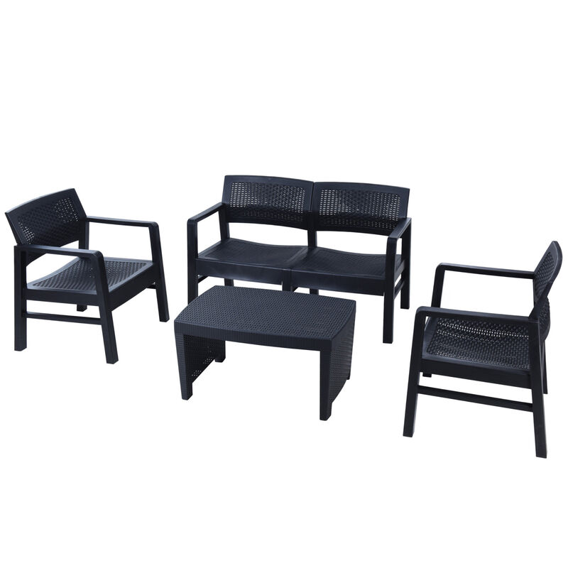 Mit diesem Gartenmöbel-Set können Sie sich eine bequeme Sitzgruppe einrichten. Die Kunststoffmöbel im zeitlosen Design sind witterungsbeständig und stabil. Die Sitzbank und die beiden Stühle laden zum entspannten Verweilen ein. Getränke und Snacks können auf dem praktischen Beistelltisch platziert werden. Holen Sie sich diese anthrazit-farbigen Möbel mit Rattan-Struktur auf Ihre Terrasse oder in Ihren Garten!