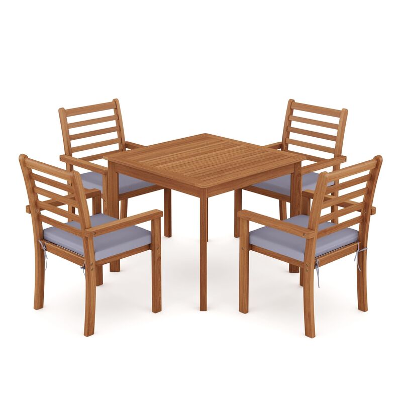 Entspanntes Frühstück, kurzer Lunch oder ausgiebige Grillade – an diesem Holztisch verbringst du gemeinsame Momente mit Familie und Freunden. Der quadratische Tisch passt auch auf kleine Balkone und Dachterrassen. Die vier Stühle lassen sich prima um den Esstisch gruppieren und laden mit ihrem weichen Sitzkissen zum Verweilen ein. Die weichen Kissen lassen sich mit Bändeln rutschfest am Stuhl befestigen und können auch problemlos entfernt werden. Worauf wartest du noch? Hole dir ein mediterranes Ambiente in den Garten mit diesem rustikalen Gartenmöbel Set APULIA aus Naturholz!