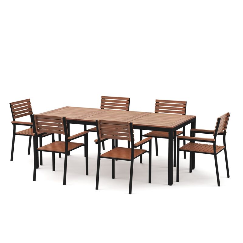 Originelle Sitzgarnitur für den modernen Garten. Das einzigartige Zusammenspiel aus rötlichem Naturholz mit schwarz gefärbtem Metall sorgt für WOW-Momente bei deinen Gästen. Auf den sechs Gartenstühlen können du und deine Freunde sich bequem hinsetzen und eine Grillade geniessen. Die Armlehnen sind ebenfalls mit Holz verkleidet – was nicht nur schön aussieht, sondern auch äusserst bequem ist. Der Gartentisch bietet viel Platz fürs gemütliche Beisammensitzen. Gestalte deinen Gartensitzplatz besonders schön mit diesem Gartenmöbel Set MARCIA im trendigen Fabrik-Chic!