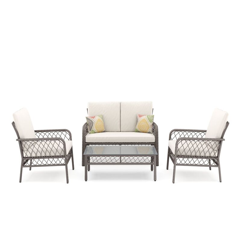 Diese Gartenmöbel bestechen durch ihr harmonisches Zusammenspiel von geschwungenen Formen und geradlinigem Material. Das klassische Rattan wird auf originelle Weise mit Stahl, Glas und Dekoelementen kombiniert. Der freundliche Beigeton passt zu fast jeder Gartenterrasse und jeder Wintergarteneinrichtung. Auf den weichen Kissen kannst du dich entspannt zurücklehnen und den Moment geniessen. Der Loungetisch bietet Platz für Apéro, Getränke, Zeitschriften und vieles mehr. Lies deine Lieblingszeitung auf diesem gemütlichen Gartenset ARIMBA in aussergewöhnlichem Design!