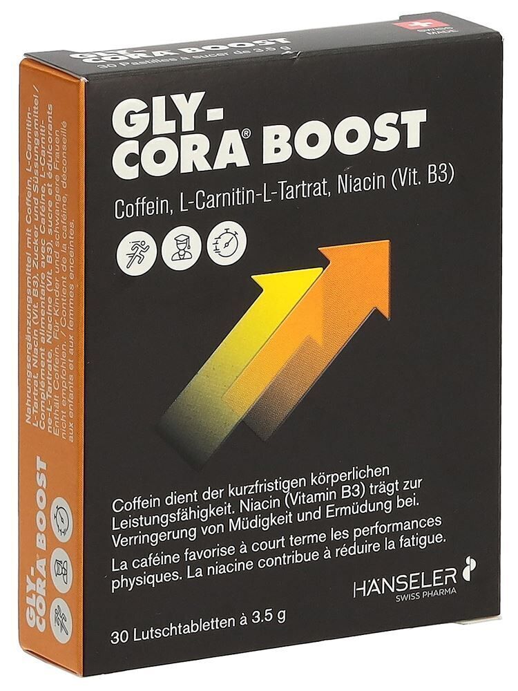 Sachbezeichnung Nahrungsergänzungsmittel Zusammensetzung Glucosesirup ; Zucker ; L-Carnitin-L-Tartrat; Wasser; pflanzliche Fette (Palm); Coffein; Emulgatoren: E471, Sojalecithin E322 ; Niacin ; Verdickungsmittel : Gélatine, E414 ; Aroma ; Süssungsmittel : E950; Farbstoff : E160. Pro 1 Portion (2 Stück/7g) L-Carnitin-L Tartrat 600mg Coffein 80mg Niacin (Vitamin B3) 16mg. Eigenschaften Enthält kein Nikethamid. Es birgt damit kein Dopingrisiko und darf von Sportlerinnen und Sportlern auch an Wettkämpfen eingesetzt werden. Anwendung Gly-Cora® Boost kann verwendet werden bei: Ermüdungserscheinungen bei körperlicher Anstrengung Mentaler Beanspruchung Empfehlung: 2 Lutschtabletten 30 Minuten vor der körperlichen oder mentalen Aktivität im Mund zergehen lassen. Maximal 5 Lutschtabletten pro Tag einnehmen. Hinweise Enthält Coffein. Für Kinder und schwangere Frauen nicht empfohlen. Die empfohlene tägliche Verzehrsmenge darf nicht überschritten werden. Nahrungsergänzungsmittel sind kein Ersatz für eine ausgewogene abwechslungsreiche Ernährung und eine gesunde Lebensweise. Ausserhalb der Reichweite von kleinen Kindern aufbewahren. Kühl und trocken lagern. Zusatzinfo Enthält Zucker und Süssungsmittel. Laktosefrei; glutenfrei.