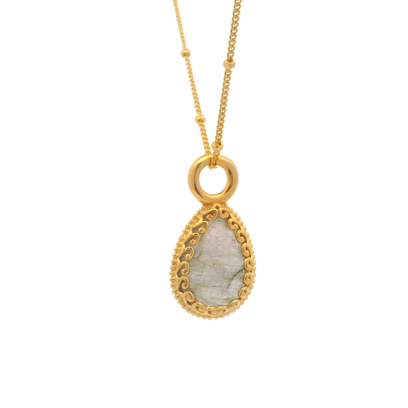 Eine wunderschöne und filigrane Halskette mit einem tropfenförmigen und zart-umfassten Labradorit als Highlight.