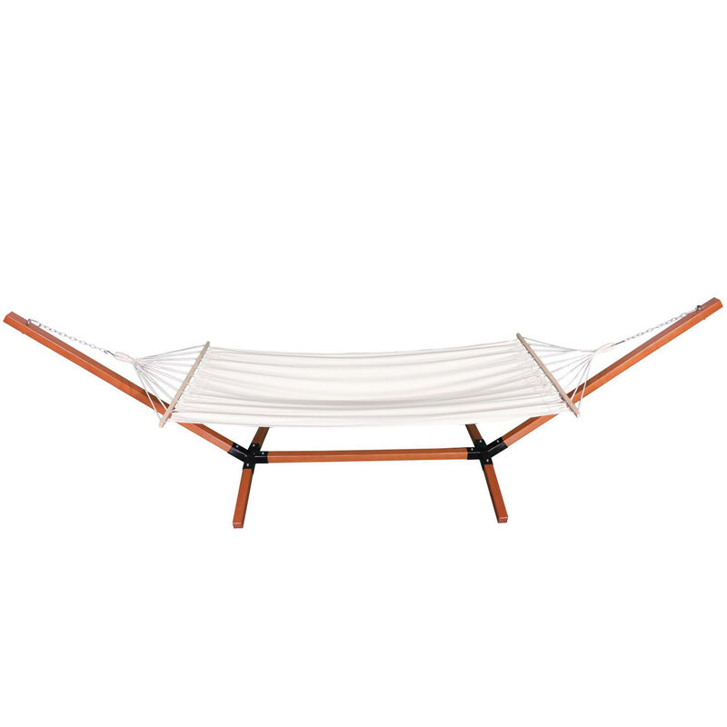 Auf dieser Hängematte können Sie gemütlich im Garten und auf der Terrasse entspannen. Da die Liegematte über ein Gestell verfügt, benötigen Sie keine Aufhängemöglichkeit. Am Kopf- und Fussende der Matte sorgen Holzleisten dafür, dass die Liegefläche breit aufgespannt ist und bequemes Relaxen ermöglicht. Das robuste Gestell aus Hartholz und Metallverbindern ist wetterfest und langlebig. Lesen Sie ein spannendes Buch oder geniessen einfach die sommerliche Sonne auf dieser komfortablen Hängematte!