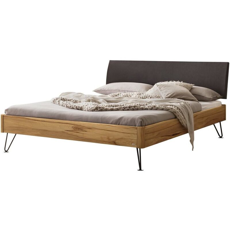 Bettgestell 160x200cm, Metall anthrazit, Wildbuche natur geölt, Bezug Kunstleder smoke