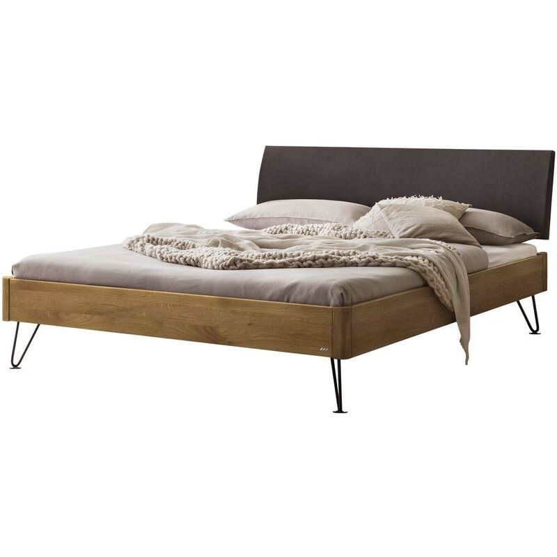 Bettgestell 180x200cm, Metall anthrazit, Wildeiche natur geölt, Bezug Kunstleder smoke