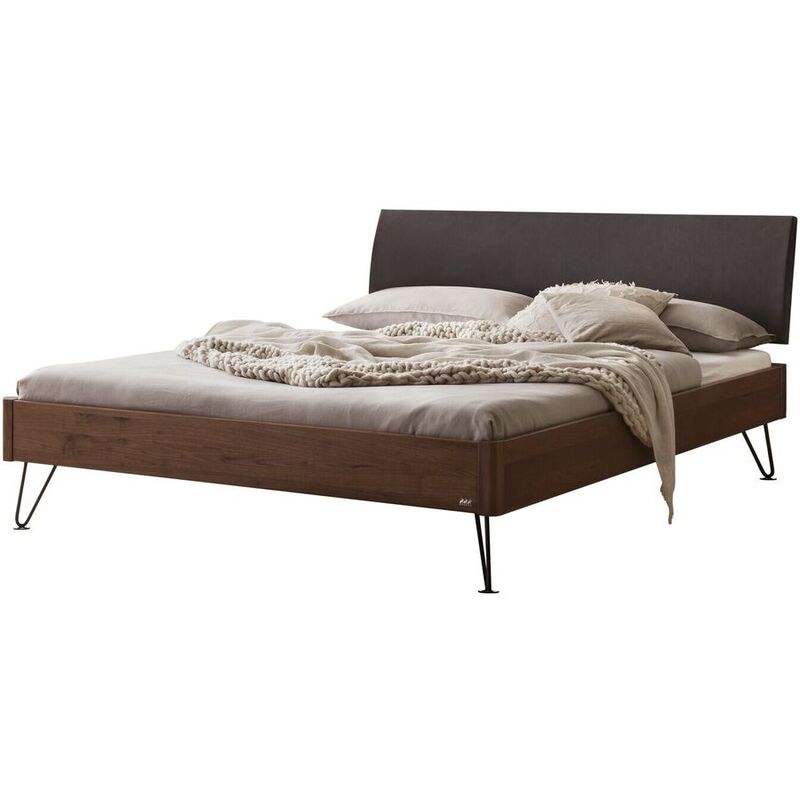 Bettgestell 160x210cm, Metall anthrazit, Nussbaum geölt, Bezug Kunstleder smoke