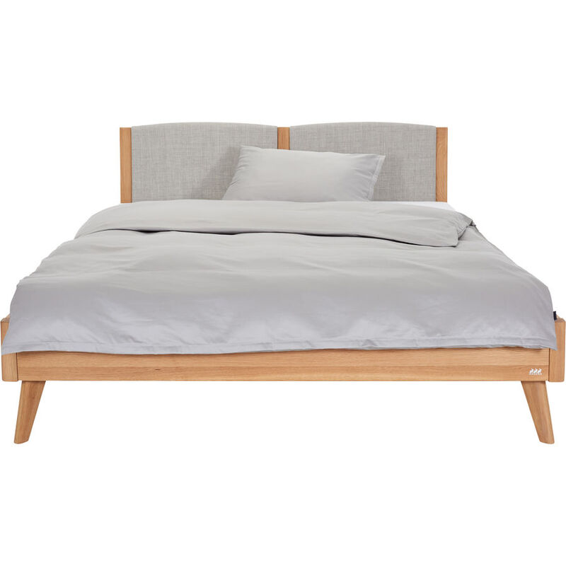 Bett – Bett Lounge – Eiche – B 160 T 200 H 38 cm – Bettrahmen Eiche massiv, inkl. Kopfteil Eiche massiv mit grauem Stoff und Füsse in Eiche massiv, ohne Bettinhalt