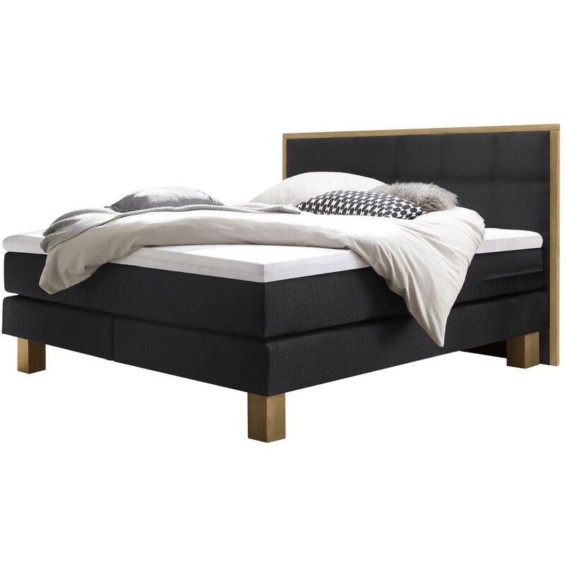 Boxspringbett mit PU-Schaum-Topper fest, Base-Top – Boxspringbett Cottage – Eiche – B 140 T 200 H 120 cm – Stellmass: 148 x 210cm, PU-Schaum-Topper, RG 35, 5cm hoch – Matratze: 609 Taschenfedern, Wattierung 100% PES; Topper: Bezug 100% PES, Füllung 100% Klimawatte; Box: 240 Bonellfedern