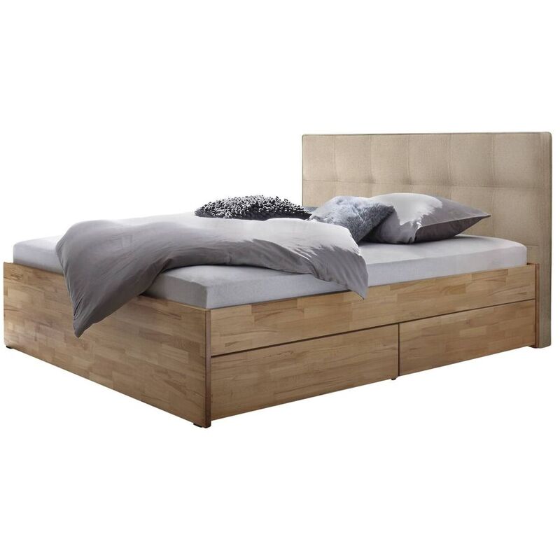 Bett Tip-on 180x200cm Kernbuche beige – Stauraumbett Shepherd – Kernbuche – B 180 T 200 H 122 cm – Stellmass: 188x205x122cm – Bezug Pepe: 100% PES / Lichtechtheit: 5 / Reibeechtheit: 4-5 / Pilling: 5 / Scheuerfestigkeit: 15'000 / Gewicht: 268g/m2 / Frei von allergisierenden Farbstoffen, Azo-Farbstoffen, Formaldehyde und Dimethylfumarate
