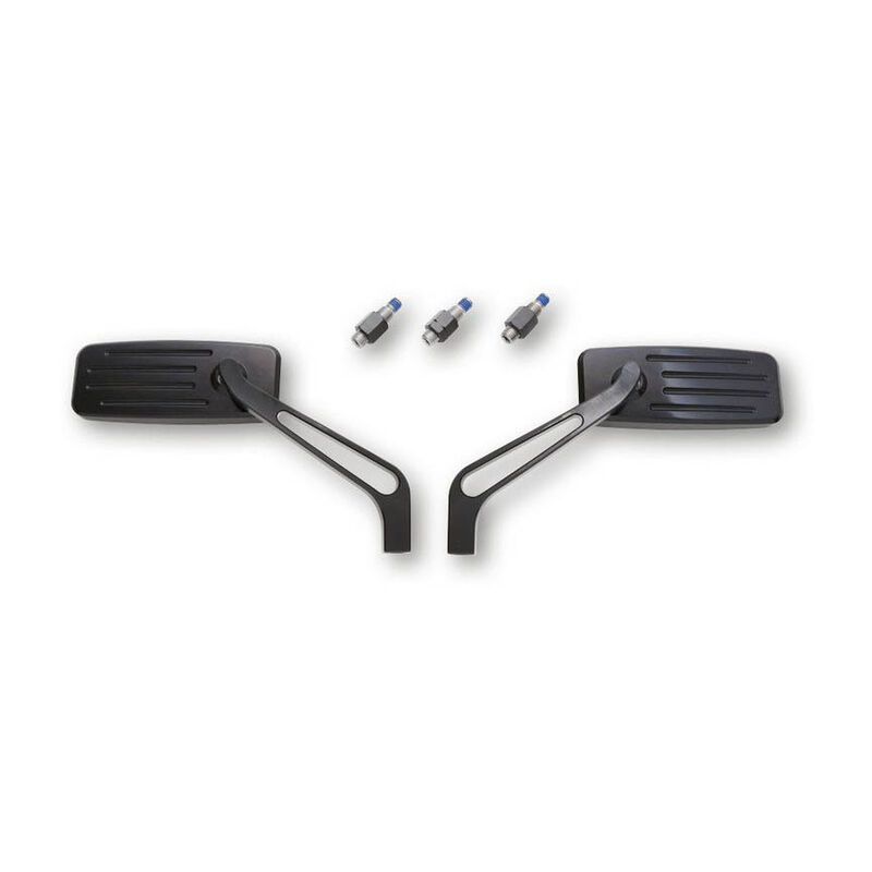 HIGHSIDER LENKERSPIEGEL ACTION, (PAAR)Nicht zur Verwendung im Strassenverkehr! Nur für Show und Racing Zwecke! Hochwertig verarbeiteter, CNC-gefräster Spiegel in rechteckiger Form. Kopf aus Aluminium, mit verstellbarem Stiel. MASSE: * Breite Kopf: 120mm * Höhe Kopf: 48mm * Länge Arm bis zum Gelenk: 140mm * Länge Arm bis zum Gewindebolzen: 170mm LIEFERUMFANG: * 1 Paar, nicht E-geprüft