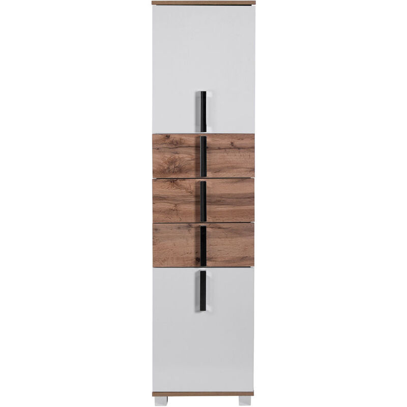 Hochschrank weiss glanz/Eiche-Landhaus – Hochschrank Sezai – Holzwerkstoff – B 40.3 T 32 H 163.7 cm – Schubkasteninnenmass ca. 33,2 x 27,5 x 13,3 cm – 2 Einlegeböden