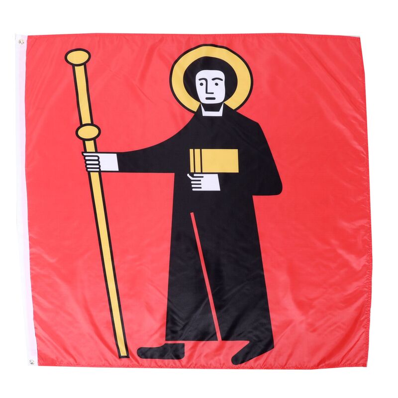 “In Rot der nach rechts schreitende, schwarzgewandete Glaubensbote Fridolin, mit dem Beschauer zugewandtem barhäuptigen Kopf mit goldenem Nimbus, in der Rechten einen goldenen Stab, in der Linken ein goldenes Buch haltend“