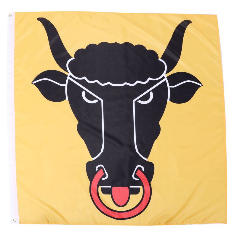 “In Gold ein schwarzer Stierkopf mit roter Zunge und rotem Nasenring“