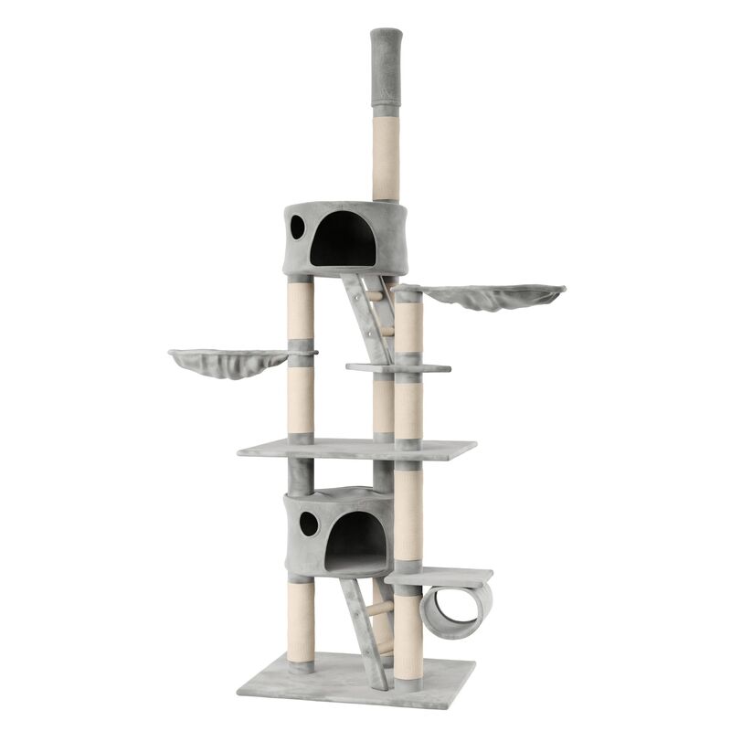 Du hast ein Wohnzimmer mit hoher Decke? Überrasche deinen Liebling mit diesem Kletterturm XXL! Die Leiterchen und Plattformen bieten Kletterspass – an den Sisalstämmen kann dein Stubentiger seine Krallen pflegen. Wenn er mal eine Pause braucht, kann er im Körbchen oder Häuschen ein Nickerchen machen. Kaufe dir jetzt diesen pflegeleichten und langlebigen Katzenbaum!