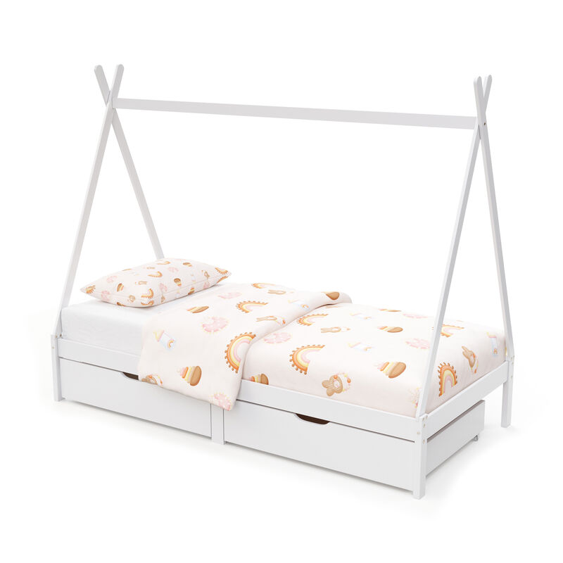Dieses weisse Holzbett ist ein Traum! Das Bett passt in jedes Kinderzimmer und begeistert mit seiner originellen Tipi-Form. In den zwei Ausziehschubladen können allerlei Spielzeug, Stofftiere und Ersatzbettwäsche verstaut werden. Die Höhe ist niedrig und sorgt damit für Sicherheit. Das Bettgestell kann einfach mit Girlanden verziert oder mittels Decken zu einem Zelt umgebaut werden. Lass dein Kind seine Fantasie ausleben und erholsam Schlafen mit diesem Kinderbett TENDA!