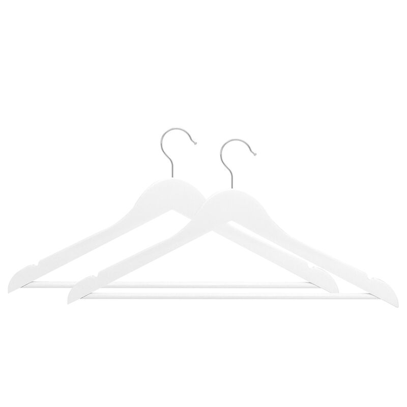 Mit diesen schlanken weissen Holzkleiderbügeln nutzt du den Platz in deinen Schränken optimal. Die glatte Oberfläche schont feine Stoffe und schwere Kleidungsstücke werden sicher gehalten. Dank den seitlichen Kerben bleiben Röcke perfekt in Form, während Hosen knitterfrei über die Querstange gelegt werden können. Sorge mit diesen schlichten Bügeln für ordentliche Aufbewahrung deiner Kleidungsstücke!