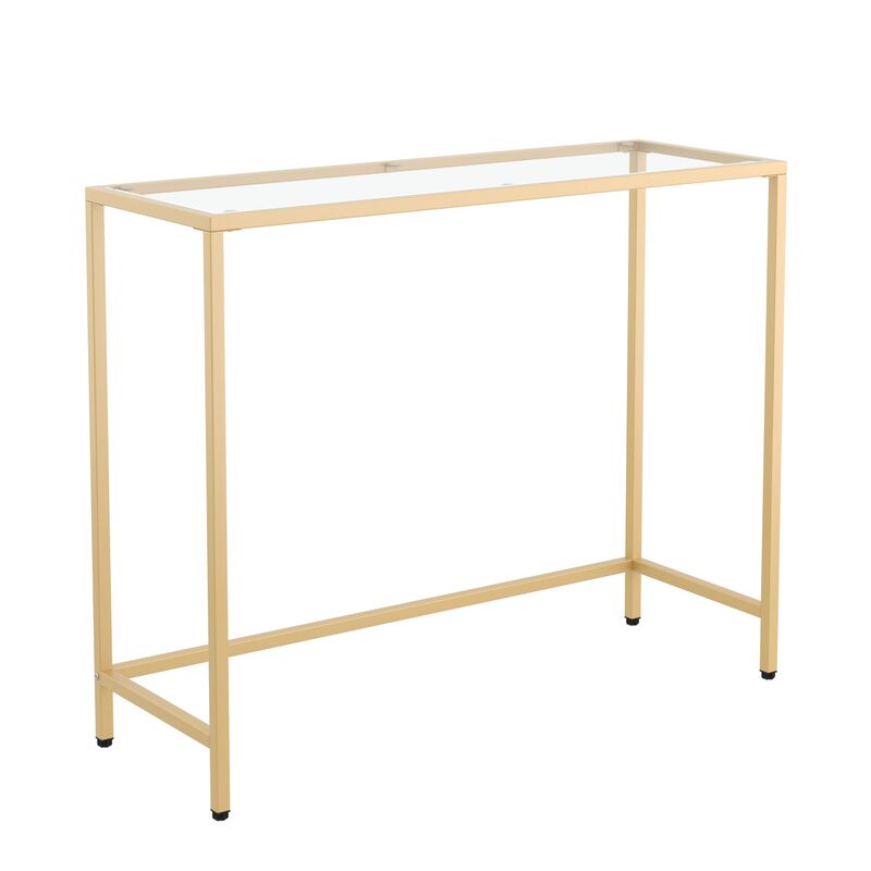 Mit diesem stilvollen Highboard TYRO bringst du Eleganz in dein Zuhause. Der goldene Metallrahmen und die edle Glasplatte verleihen deinem Wohnzimmer oder Eingangsbereich einen luxuriösen Touch. Die Ablagefläche bietet Platz für Schlüssel, Fotos, Kerzen und deine liebsten Deko-Stücke. Bodenschonende Kunststoff-Nivellierfüsse sorgen für stabilen Halt, während das robuste und pflegeleichte Material für eine lange Lebensdauer garantiert. Kombiniere ihn mit weiteren Möbeln der TYRO-Kollektion und mach dein Zuhause noch schöner. Hol dir jetzt deinen Design-Konsolentisch!