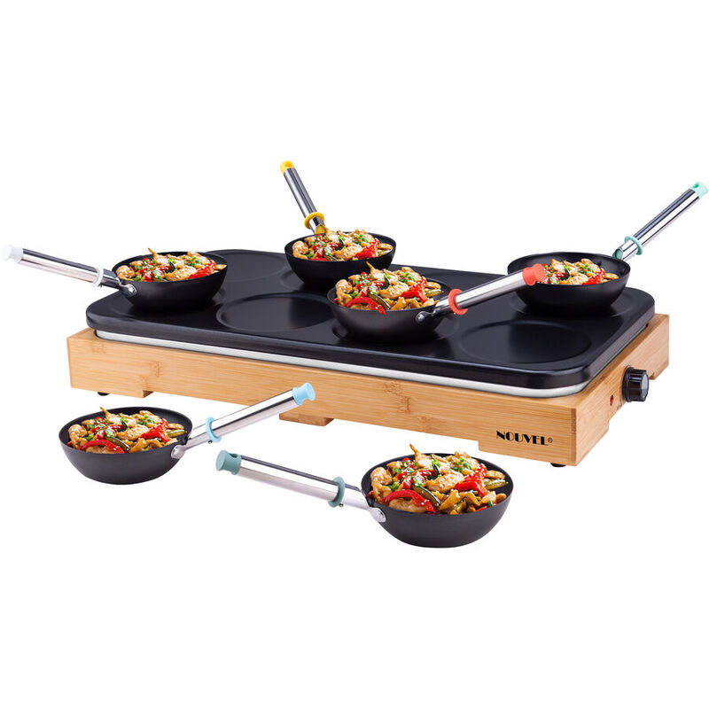 Wok und Crepes Party Gerät – Küchengerät Cheese – Edelstahl/Bambus – B 64 T 31 H 12 cm – – 2-in-1-Gerät für Wok oder Crêpes– 8 kleine antihaftbeschichtete Woks