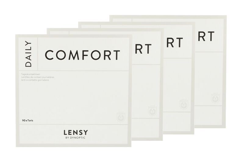 Lensy Daily Comfort Toric,4 x 90 Stück Kontaktlinsen von Lensy by Dynoptic. Tageslinsen aus Nelfilcon A mit innovativem3-Phasen-Feuchtigkeitskomplex und 69 % Wassergehalt.