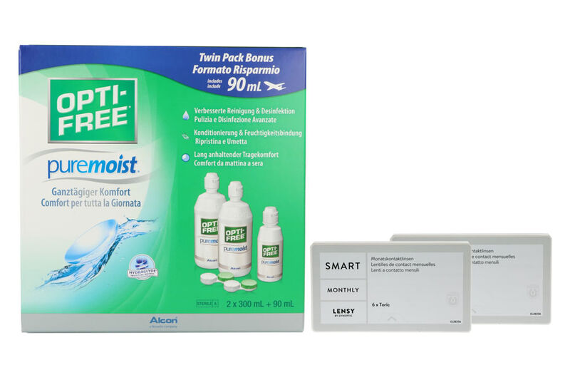 Lensy Monthly Smart Toric 2 x 6 Monatslinsen + Opti Free Pure Moist Halbjahres-Sparpaket