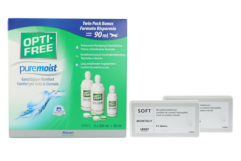 Lensy Monthly Soft Spheric 2 x 6 Monatslinsen + Opti Free Pure Moist Halbjahres-Sparpaket