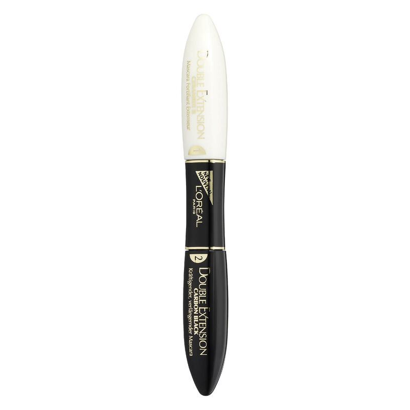 Die Double Extension Mascara von L’Oréal Paris verfügt über zwei Bürsten und verlängert Ihre Wimpern optisch in zwei Schritten. Sie wirkt kräftigend und optisch ultra-verlängernd – für einen sichtbar gestärkten Augenaufschlag. Die cremige weisse Basis mit schützender Formel aus Ceramid R und pflanzlichen Fasern umhüllt die Wimpern und lagert Fasern an. Pro-Vitamin B5 pflegt zusätzlich. Die weisse Basis sorgt für ultra intensive Leuchtkraft des schwarzen Topcoats. Der Topcoat hüllt die Wimpern in ein verführerisches Schwarz und vollendet den verlängernden Zweifacheffekt. Das Wirkprinzip der Wasserfestigkeit basiert auf einem leicht volatilen Öl das nach dem Auftragen des Mascaras verdampft.