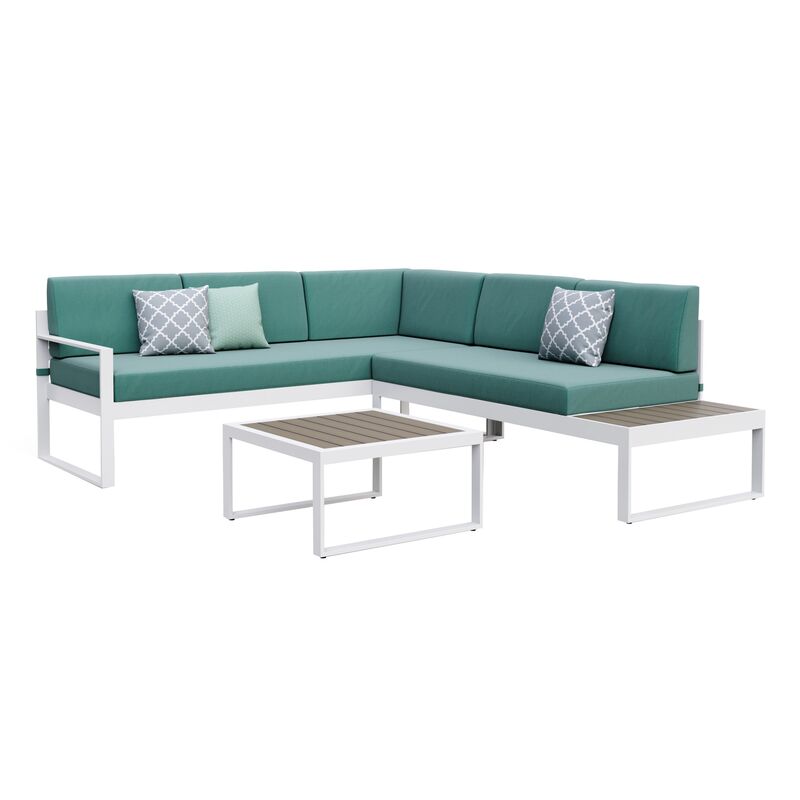 Die Sitzgarnitur LILIANA überzeugt durch schlichtes Design und Funktionalität. Die bequemen Kissen in sommerlich frischem Türkis laden zum gemütlichen Verweilen mit Familie und Freunden ein. Je nach deinen Bedürfnissen können die Sitzbänke auch einzeln verwendet werden. Der rostfreie Aluminiumrahmen mit Ablageflächen aus Polywood sorgt für Witterungsbeständigkeit und Langlebigkeit. Gestalte mit dieser komfortablen Lounge deine Gartenterrasse zu einer Wohlfühloase!