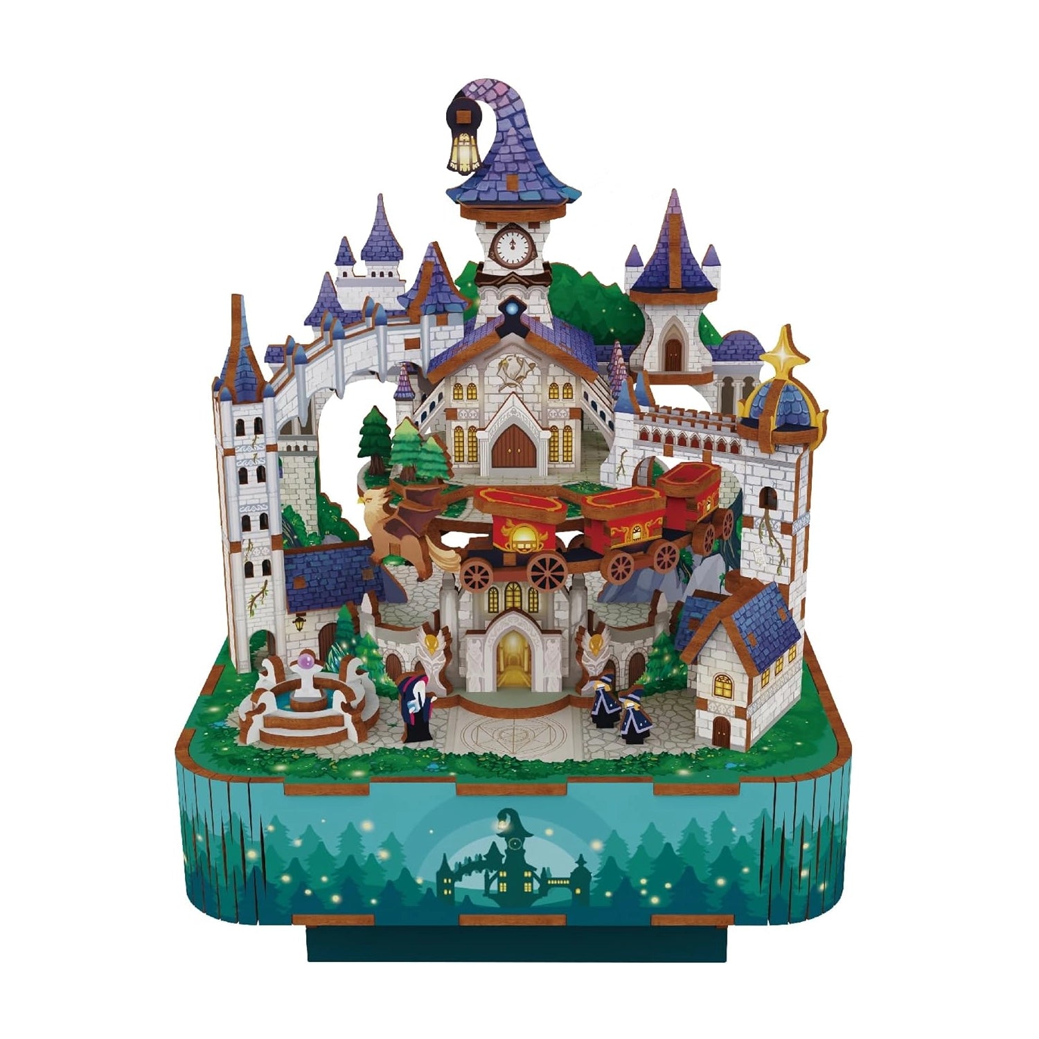 Erbaue dein eigenes magisches Schloss mit dieser faszinierenden DIY-Spieluhr. Das detailreiche Modell begeistert mit seinen hohen Türmen, einem geheimnisvollen Zauberer und einer fliegenden Kutsche, die von einem Hippogreifen gezogen wird. Während die Melodie Academy of Magic erklingt, dreht die Kutsche majestätisch ihre Kreise, während leuchtende Details das Schloss in eine zauberhafte Atmosphäre tauchen.