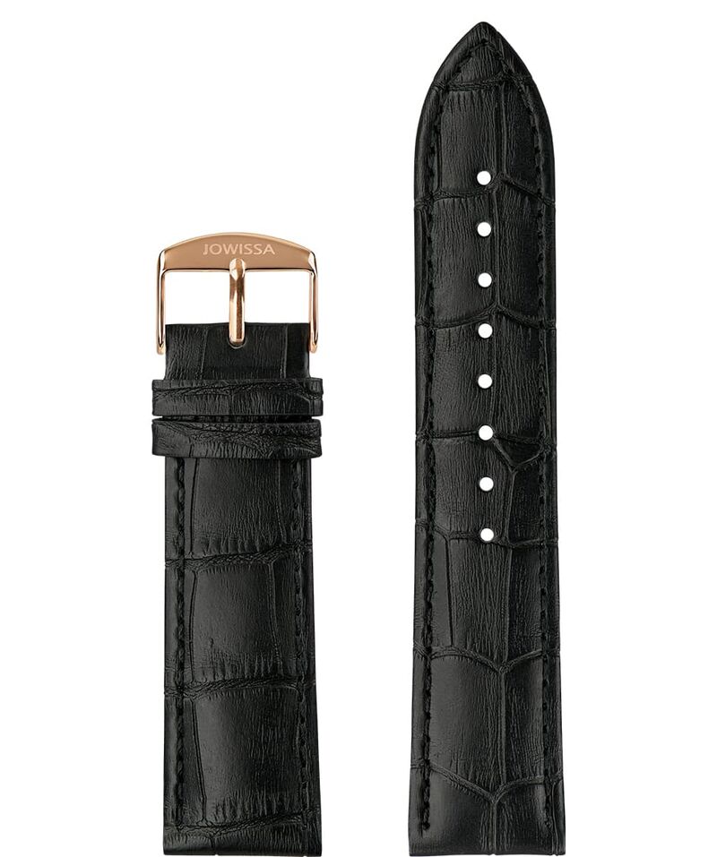 BandmaterialEchtes Leder-Uhrband mit semi-matter Alligatorprägung Bandanstossbreite22 mm SchliesseAus Edelstahl mit lasergraviertem Logo SchliessenfarbeRotgold Auswechselbares BandJa, mit quick release ColorSchwarz / Rosa ReferenceE3.1443.XL