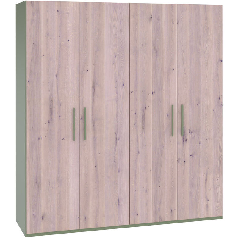 Drehtürenschrank – Kleiderschrank Holz Werk – Wildeiche – B 203 T 60 H 220 cm – Drehtürenschrank Holz Werk 4-türig besteht aus:1 Grundelement inkl. 1 Fachboden mit Kleiderstange, gross1 Anbauelement inkl. 1 Fachboden mit Kleiderstange, grossKorpus RAL 6021 blassgrün4 Türen Wildeiche furniert, bianoinkl. Türdämpfermit Profilgriffen RAL 6021 blassgün