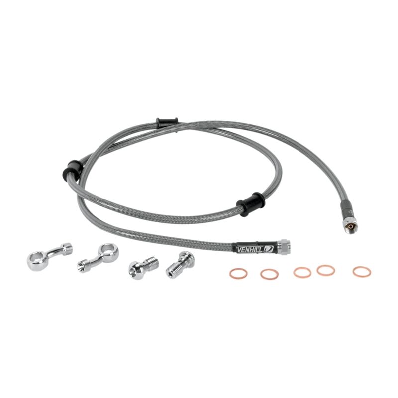 STAHLFLEXBREMSLEITUNG VON MOOSE RACING Optimiere dein Bremssystem mit einer Stahlflex-Bremsleitung von Moose Racing – hergestellt von dem englischen Spezialist Venhill. Jede Bremsleitung ist mit Top Qualitäts Dupont-Teflon beschichtet und ummantelt mit Edelstahl, zusätzlich ist die Oberfläche PVC beschichtet für einen noch besseren Schutz. * Besserer Druckpunkt * Maschinell verpresste Alu-Anschlüsse * Absorbiert im Gegensatz zu Kunststoffleitungen Wasser Durite de frein,Stahlflexleitung,Edelstahlbremsleitung,Brakeline,bremsschlauch Passend auf: KAWASAKI KLR650