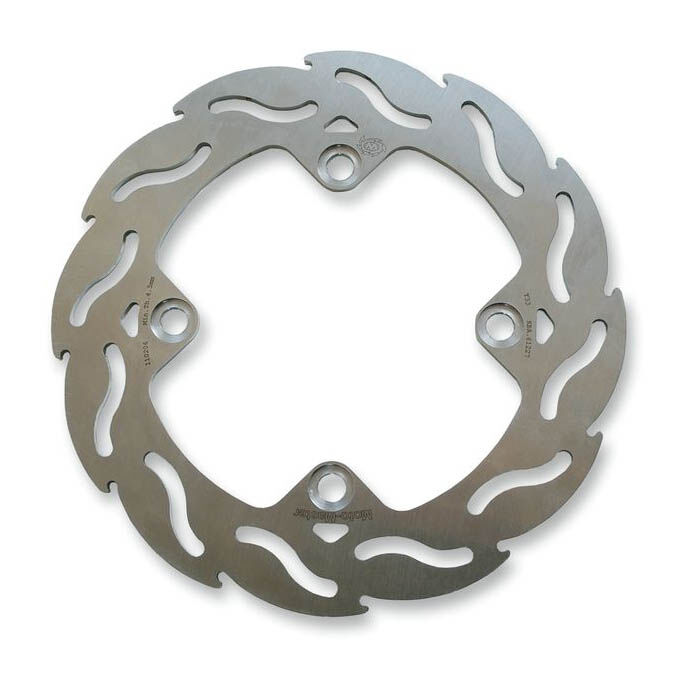 MOTO-MASTER® BREMSSCHEIBE FLAME, 240MM, HINTENDie Moto-Master Flame Fixed Discs werden unter Einhaltung engster Toleranzen und Spezifikationen aus einem speziell gehärteten, hochwertigen Edelstahl gefertigt. Zur Steigerung der Leistung werden die Bemsscheiben mit dem Flame-Design ausgestattet. Das Flame-Design hilft bei der Kühlung und Reinigung der Kontaktfläche. MERKMALE: * Bolt-on Leistungssteigerung * Optimale Wärmeableitung und eine perfekte Reinigung der Bremsbelagoberfläche * Hervorragendes Feedback an den Fahrer * Gleichmässiger Bremsbelagkontakt während der gesamten Rotation der Scheibe sorgt für eine lineare Verzögerung * CNC-gefräst und beidseitig präzisionsgeschliffen für perfekte Passgenauigkeit und Ebenheit * Für beste Performance empfehlen wir die Verwendung von Moto-Master Bremsbelägen * Mit CH-ZULASSUNG erhältlich