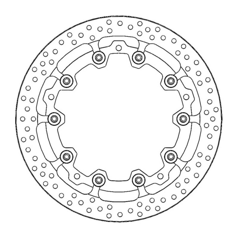 MOTO-MASTER® BREMSSCHEIBE HALO T-FLOATER 6.0, 320MM, VORNE LINKS Die ultimative Racing Bremsscheibe für den professionellen Rennfahrer. * Erhältlich in 6.0mm Dicke und in 7.1mm WSBK-Dicke * Das Halo-Aussenringdesign gewährleistet eine gleichmässige Wärmeverteilung bei hoher thermischer Belastung, während die Kontaktfläche des Bremsbelags gleichmässig gereinigt wird. * Die Dicke des Aussenrings beträgt 6.0mm und verfügt über einen zusätzlichen Kühlschlitz zwischen Träger und Bremsscheibe. * Der lasergeschnittene und präzisionsgeschliffene Aussenring ist an einem schwarz eloxierten, CNC-gefrästen Träger aus Flugzeugaluminium befestigt * Die T-Floater Pin-Slot Konstruktion ermöglicht eine hohe mechanische Belastung bei minimalem Verschleiss. * Das T-Floater-System ist dank der speziell entwickelten, hart eloxierten Aluminium-Floater sehr leicht. NICHT FÜR DEN ÖFFENTLICHEN STRASSENVERKEHR GEEIGNET. Racing bremsscheibe,road racing bremse,professional racing,strassenrennen bremsscheibe,t floater,t-schwimmer,fim zugelassen,fim homologiert,fim superbike homologiert,runde bremsscheibe,halo rotor,halo disc,disque halo,disco halo,disco rotondo,disque ronde,round brake rotor,gelochte bremsscheibe,schwimmende Bremsscheibe,schwimmend gelagerte Bremsscheibe,vorderbremse,front brake rotor,frein avant,disque avant,freno anteriore,disco freno flottante,disque frein flottant,floating rotor,disque deux pieces,disco freno flottante,disque frein flottant,floating rotor,disque deux pieces,schwimmend gelagerte Bremsscheibe,zweiteilige bremsscheibe,schwimmende scheibe,2teilige Bremsscheibe,bremscheibe,scheibenbremse,bremsteller,brake disc,disque frein,disco freno,brake rotor,mx bremsscheibe,motorrad bremsscheibe,brämsschiibe,brakingdisc,brakingdisque,brämsschiibä Passend auf: KTM RC 125 RC 390