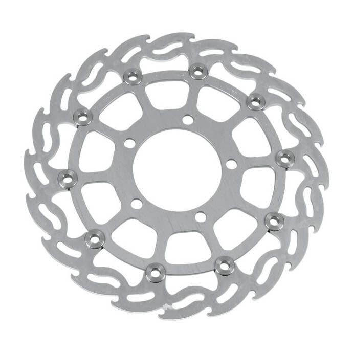 MOTO-MASTER® BREMSSCHEIBE FLAME FLOATING, 280 MM, VORNE LINKS Die Bremsscheibe im Flame Design ist die perfekte Lösung für Fahrer, die nach mehr Bremskraft suchen. Schwimmend gelagert mit einem Aluminium-Innenträger und versehen mit dem innovativen Flame-Design bietet sie einen spürbaren Leistungszuwachs gegenüber der Original-Bremsscheibe. Das Flame-Design bietet eine optimale Kühlung und ein unübertroffen sanftes und besser berechenbares Bremsverhalten, das es dir ermöglicht, härter zu bremsen. BACKYARD RACING DETAILS: * Extrem leichtes Design * CNC-gefräster Innenring aus Flugzeugaluminium * Ultraleichte Edelstahl-Floater * Optimale Wärmeableitung und eine perfekte Reinigung der Bremsbelagoberfläche * Hervorragendes Feedback an den Fahrer * Gleichmässiger Bremsbelagkontakt während der gesamten Rotation der Scheibe sorgt für eine lineare Verzögerung * CNC-gefräst und beidseitig präzisionsgeschliffen für perfekte Passgenauigkeit und Ebenheit * Für beste Performance empfehlen wir die Verwendung von Moto-Master Bremsbelägen * Auch als Racing-Version für den professionellen Rennsport und den Einsatz auf der Rennstrecke erhältlich * Mit CH-ZULASSUNG erhältlich