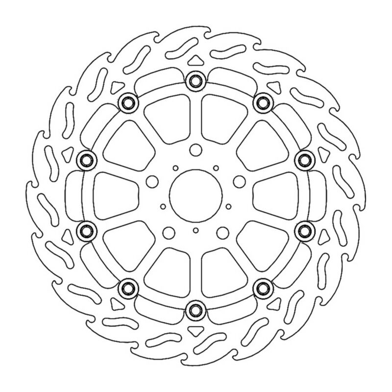MOTO-MASTER® BREMSSCHEIBE FLAME FLOATING, 296 MM, VORNE LINKS Die Bremsscheibe im Flame Design ist die perfekte Lösung für Fahrer, die nach mehr Bremskraft suchen. Schwimmend gelagert mit einem Aluminium-Innenträger und versehen mit dem innovativen Flame-Design bietet sie einen spürbaren Leistungszuwachs gegenüber der Original-Bremsscheibe. Das Flame-Design bietet eine optimale Kühlung und ein unübertroffen sanftes und besser berechenbares Bremsverhalten, das es dir ermöglicht, härter zu bremsen. BACKYARD RACING DETAILS: * Extrem leichtes Design * CNC-gefräster Innenring aus Flugzeugaluminium * Ultraleichte Edelstahl-Floater * Optimale Wärmeableitung und eine perfekte Reinigung der Bremsbelagoberfläche * Hervorragendes Feedback an den Fahrer * Gleichmässiger Bremsbelagkontakt während der gesamten Rotation der Scheibe sorgt für eine lineare Verzögerung * CNC-gefräst und beidseitig präzisionsgeschliffen für perfekte Passgenauigkeit und Ebenheit * Für beste Performance empfehlen wir die Verwendung von Moto-Master Bremsbelägen * Auch als Racing-Version für den professionellen Rennsport und den Einsatz auf der Rennstrecke erhältlich * Mit CH-ZULASSUNG erhältlich