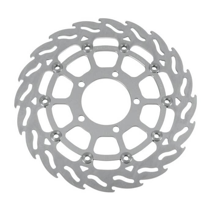 MOTO-MASTER® BREMSSCHEIBE FLAME FLOATING, 300 MM, VORNE RECHTS Die Bremsscheibe im Flame Design ist die perfekte Lösung für Fahrer, die nach mehr Bremskraft suchen. Schwimmend gelagert mit einem Aluminium-Innenträger und versehen mit dem innovativen Flame-Design bietet sie einen spürbaren Leistungszuwachs gegenüber der Original-Bremsscheibe. Das Flame-Design bietet eine optimale Kühlung und ein unübertroffen sanftes und besser berechenbares Bremsverhalten, das es dir ermöglicht, härter zu bremsen. BACKYARD RACING DETAILS: * Extrem leichtes Design * CNC-gefräster Innenring aus Flugzeugaluminium * Ultraleichte Edelstahl-Floater * Optimale Wärmeableitung und eine perfekte Reinigung der Bremsbelagoberfläche * Hervorragendes Feedback an den Fahrer * Gleichmässiger Bremsbelagkontakt während der gesamten Rotation der Scheibe sorgt für eine lineare Verzögerung * CNC-gefräst und beidseitig präzisionsgeschliffen für perfekte Passgenauigkeit und Ebenheit * Für beste Performance empfehlen wir die Verwendung von Moto-Master Bremsbelägen * Auch als Racing-Version für den professionellen Rennsport und den Einsatz auf der Rennstrecke erhältlich * Mit CH-ZULASSUNG erhältlich