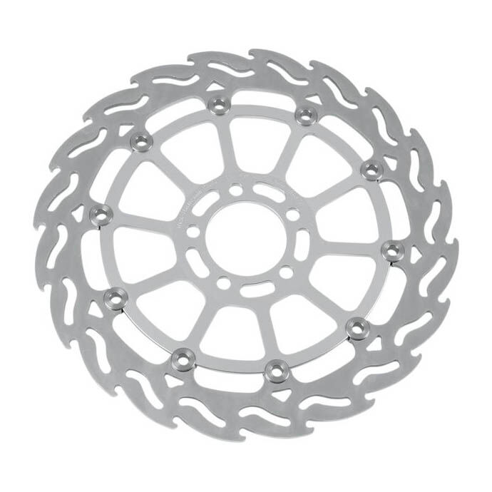 MOTO-MASTER® BREMSSCHEIBE FLAME FLOATING, 320 MM, VORNE RECHTS Die Bremsscheibe im Flame Design ist die perfekte Lösung für Fahrer, die nach mehr Bremskraft suchen. Schwimmend gelagert mit einem Aluminium-Innenträger und versehen mit dem innovativen Flame-Design bietet sie einen spürbaren Leistungszuwachs gegenüber der Original-Bremsscheibe. Das Flame-Design bietet eine optimale Kühlung und ein unübertroffen sanftes und besser berechenbares Bremsverhalten, das es dir ermöglicht, härter zu bremsen. BACKYARD RACING DETAILS: * Extrem leichtes Design * CNC-gefräster Innenring aus Flugzeugaluminium * Ultraleichte Edelstahl-Floater * Optimale Wärmeableitung und eine perfekte Reinigung der Bremsbelagoberfläche * Hervorragendes Feedback an den Fahrer * Gleichmässiger Bremsbelagkontakt während der gesamten Rotation der Scheibe sorgt für eine lineare Verzögerung * CNC-gefräst und beidseitig präzisionsgeschliffen für perfekte Passgenauigkeit und Ebenheit * Für beste Performance empfehlen wir die Verwendung von Moto-Master Bremsbelägen * Auch als Racing-Version für den professionellen Rennsport und den Einsatz auf der Rennstrecke erhältlich * Mit CH-ZULASSUNG erhältlich