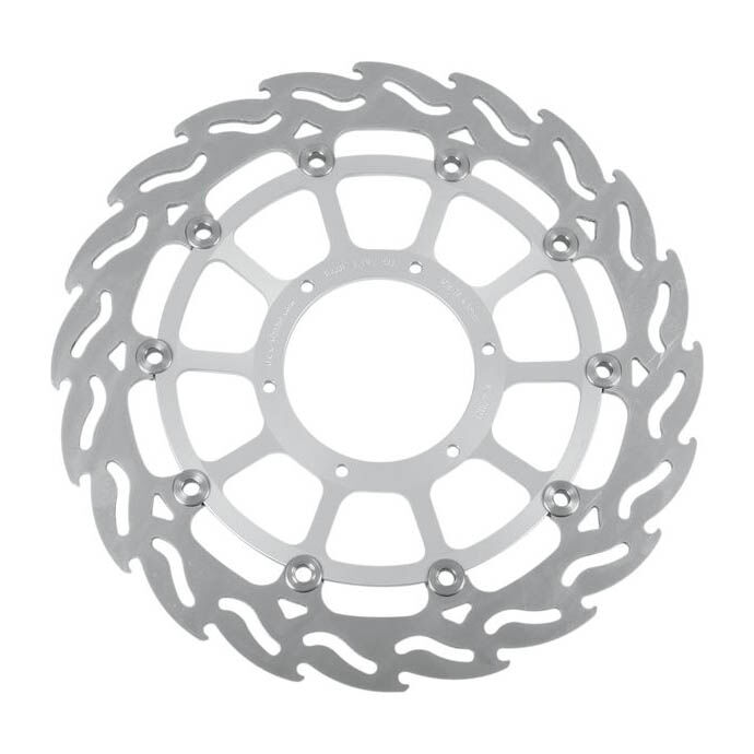 MOTO-MASTER® BREMSSCHEIBE FLAME FLOATING, 320 MM, VORNE RECHTS Die Bremsscheibe im Flame Design ist die perfekte Lösung für Fahrer, die nach mehr Bremskraft suchen. Schwimmend gelagert mit einem Aluminium-Innenträger und versehen mit dem innovativen Flame-Design bietet sie einen spürbaren Leistungszuwachs gegenüber der Original-Bremsscheibe. Das Flame-Design bietet eine optimale Kühlung und ein unübertroffen sanftes und besser berechenbares Bremsverhalten, das es dir ermöglicht, härter zu bremsen. BACKYARD RACING DETAILS: * Extrem leichtes Design * CNC-gefräster Innenring aus Flugzeugaluminium * Ultraleichte Edelstahl-Floater * Optimale Wärmeableitung und eine perfekte Reinigung der Bremsbelagoberfläche * Hervorragendes Feedback an den Fahrer * Gleichmässiger Bremsbelagkontakt während der gesamten Rotation der Scheibe sorgt für eine lineare Verzögerung * CNC-gefräst und beidseitig präzisionsgeschliffen für perfekte Passgenauigkeit und Ebenheit * Für beste Performance empfehlen wir die Verwendung von Moto-Master Bremsbelägen * Auch als Racing-Version für den professionellen Rennsport und den Einsatz auf der Rennstrecke erhältlich * Mit CH-ZULASSUNG erhältlich