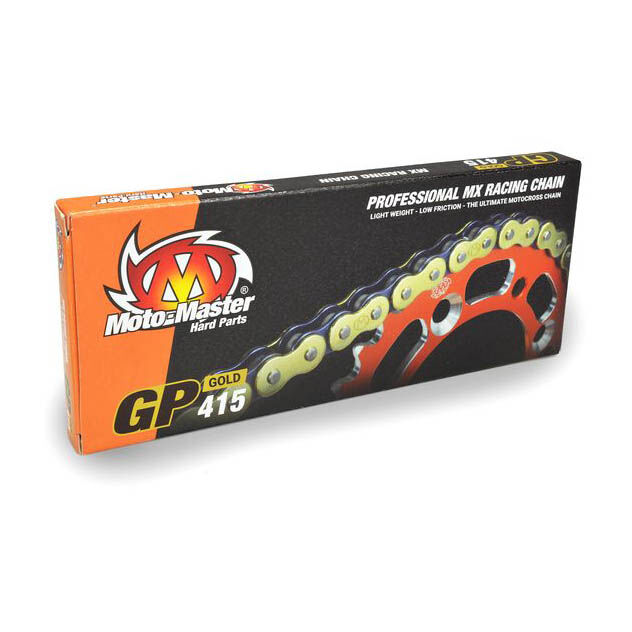 MOTO-MASTER® KETTE GP 415, 134 GLIEDER, GOLD BACKYARD RACING DETAILS: * Standardkette * Speziell für den Motocross-Einsatz entwickelt * Professionelle Rennkette mit geringem Gewicht * Alle Pins sind hartverchromt, was die Lebensdauer deutlich erhöht * Buchse und Rollen werden durch eine spezielle Kaltverformungstechnik hergestellt, die jegliche Materialverformung ausschliesst * Gold-Messing-Beschichtung der Aussenlaschen maximiert die Korrosionsbeständigkeit * Präzise vorgeformte Buchsen sorgen für eine perfekte Passung zwischen Buchsen und Bolzen, was die Kettendehnung minimiert * Alle Komponenten sind aus hochwertigem deutschen Stahl gefertigt chain,chaine,catena,rollenkette,chetti,chötti,kettä,chettä,chetä,kete Passend auf: GAS GAS MC 50 MC-E 3 MC-E 5 HUSQVARNA CR50 EE 3 EE 5 TC 50 TC 50 Mini KTM 50 Mini Adventure 50 Senior Adventure 50 Supermoto 50 SX 50 SX Junior 50 SX Mini 50 SX Pro Junior LC 50 SX Pro Senior LC 50 SX Pro Senior LC 2 50 SXR Pro SX-E 3 SX-E 5 LEM LX2 Racer LX3 Racer R2 R2 AIR R3 R3 USA AIR R3XC RX2 RX2 MOTARD 70 RX3 SM2 TRRS ONE R ONE-R