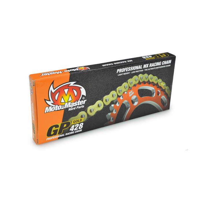 MOTO-MASTER® KETTE GP 428, 134 GLIEDER, GOLD BACKYARD RACING DETAILS: * Standardkette * Speziell für den Motocross-Einsatz entwickelt * Professionelle Rennkette mit geringem Gewicht * Alle Pins sind hartverchromt, was die Lebensdauer deutlich erhöht * Buchse und Rollen werden durch eine spezielle Kaltverformungstechnik hergestellt, die jegliche Materialverformung ausschliesst * Gold-Messing-Beschichtung der Aussenlaschen maximiert die Korrosionsbeständigkeit * Präzise vorgeformte Buchsen sorgen für eine perfekte Passung zwischen Buchsen und Bolzen, was die Kettendehnung minimiert * Alle Komponenten sind aus hochwertigem deutschen Stahl gefertigt chain,chaine,catena,rollenkette,chetti,chötti,kettä,chettä,chetä,kete Passend auf: BETA Evo 80 Junior Evo 80 Senior RR 4T 125 LC RR 4T Enduro 125 RR 4T Motard 125 GAS GAS MC 85 MC 85 (Kleinrad) HONDA CRF100F CRF125F CT110 Trail CT70 CT90 Trail EZ90 Cub NX125 SL100 ST90 XL 125 R XL100 XL100S XL125S XL185S XLR 125 R XR100 XR100R HUSQVARNA TC85 (Grossrad) TC85 (Kleinrad) KAWASAKI KD125 KD80 KD80M KE100 KE125 KE175 KLX125 KLX125L KLX140 KLX140L KX125 KTM 105 SX 85 SX (Grossrad) 85 SX (Kleinrad) SUZUKI DR-Z125 DR-Z125L DR-Z70 DR100 DR125 DR125SE DS100 DS80 JR80 RM100 RM125 RM80 RM85 RM85L RV125 RV90 SP100 SP125 TC100 TS100 TS125 TM MX85jr MX85jr Bigwheel YAMAHA CT175 DT100 DT125 DT175 MX100 MX175 RT180 RT180 Trail TT-R125 TT-R125E TT-R125L TT-R125LE TT225 TTR225 TW200 TY175 XT125 XT200 XT225 XT350 YZ125 YZ80 YZ85