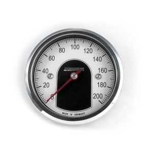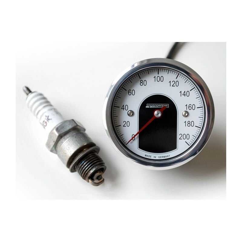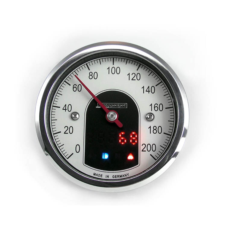 MOTOGADGET MOTOSCOPE TINY Das motoscope tiny ist ein sehr kleiner, analoger Tacho im 49mm Format. Er misst die Geschwindigkeit digital und zeigt sie über einen Schrittmotor und Zeiger präzise an. Durch den Einbaudurchmesser von 49 mm und der Einbautiefe von nur 24 mm erschließen sich vielfältige Möglichkeiten beim Einbau. Raffinierte Technik macht den klassischen Look ohne Kompromisse möglich. Das Ziffernblatt kommt ganz ohne Displayausschnitt und LCD aus und wirkt überzeugend im Classic-Style. Die perfekte Lösung für Puristen und Minimalisten. GEHÄUSE: Das hochwertige Aluminium-Gehäuse ist aus dem Vollen gedreht und seine Oberfläche schwarz eloxiert. Der Schraubring ist ebenfalls schwarz eloxiert oder hochglanzpoliert erhältlich. Das Gehäuse ist 100% wasserdicht und unempfindlich gegen Vibrationen. DISPLAY: Das analoge Ziffernblatt im Schwarzweiß-Kontrast wird von weißen LEDs indirekt beleuchtet. Hinter dem schwarzen Teil des Ziffernblattes ist eine innovative LED-Anzeige versteckt, die erst im Betrieb durch das Ziffernblatt leuchtet und im ausgeschalteten Zustand nicht sichtbar ist. Um eine optimale Ablesbarkeit bei Dunkelheit, Sonne und Dämmerung zu erreichen, wird die Leuchtstärke der LEDs automatisch angepasst. Falls die 200 km/h auf der analogen Skala überschritten werden, wird die Geschwindigkeit automatisch im LED-Display angezeigt. Ebenfalls wird die Maximalgeschwindigkeit gespeichert. Im Ziffernblatt sind ebenfalls die 4 Kontrollleuchten (blau, rot, 2 x grün) integriert. Auch diese werden erst im Betrieb sichtbar. BEDIENUNG: Mit dem mitgelieferten Menütaster oder z.B. dem Lichthupentaster am Lenker wird zwischen den Anzeigen des LED-Displays gewechselt. Die Standardanzeige auf dem Display ist die Uhrzeit. Bei Bedarf werden durch kurzen Tastendruck die Werte für Gesamtkilometer, Tageskilometer, Bordspannung usw. angezeigt. Alle Funktionen, wie Rücksetzen der Tageskilometer o. ä. sind über den Taster einfach zu bedienen. Voreinstellungen oder gespeicherte Werte bleiben selbstverständlich auch ohne Stromversorgung abgespeichert. ANBAU: Das motoscope tiny ist mittels der zwei Gewindebuchsen M3 an der Rückseite einfach anzubringen. Wir bieten für die Montage diverse Halterungen an. Siehe unter Halterungen. ANSCHLUß UND SENSOREN: Die ausführliche Montage- und Bedienungsanleitung machen den Anschluss des Instruments auch für Anwender möglich, die sich bisher von der Fahrzeugelektrik ferngehalten haben. Der mitgelieferte Tachosensor aus Edelstahl ist sehr klein (M5/23 mm) und leicht zu verstecken. Mit dem 1,5 m langen Anschlusskabel lässt er sich problemlos am Vorder- oder Hinterrad anbringen. Somit lassen sich auch Fahrzeuge mit original mechanischem Tachoantrieb einfach umrüsten. Das motoscope tiny ist mit sehr vielen originalen Tachosensoren (Reedkontakt und Näherungssensoren) der Fahrzeughersteller kompatibel. In diesem Fall werden nur noch Anschlüsse verbunden und die mechanische Installation eines Sensors wird gänzlich überflüssig. Eine intelligente Teach-Funktion ermöglicht das einfache Kalibrieren des Tachos – auch bei Fahrzeugen mit Sensoren am Getriebe wie z.B. Harley-Davidson (TM). LIEFERUMFANG: * Instrument mit ca. 75 cm Anschlusskabel * Minitaster * 2 fliegende Sicherungen * 9 Kabelendverbinder * Tachosensor (M5 x 0,5 Feingewinde, Edelstahl, IP 68) mit 150 cm Anschlusskabel * 2 starke Neodym-Mini-Magnete * 2 Befestigungsschrauben M3 mit Unterlegscheibe * 2 Dioden für die Zusammenlegung der Blinker * Ausführliche Anbau- und Bedienungsanleitung SPEZIFIKATIONEN UND FEATURES: * Einbaudurchmesser: 49 mm * Gewicht: ca. 96 g * Befestigung: 2 x M3 Gewindebuchse * Stromaufnahme im Betrieb: ca. 200 mA (belastungsabhängig) * Stromaufnahme im Ruhezustand: omA * Betriebsspannung: 9 V – 15 V * Betriebstemperatur: -20°.. +80°C * Tachometer analog (Zeiger): 0 – 200 km/h oder mph * Tachometer numerisch (LED-Display): 200 – 999 km/h oder mph * maximale Geschwindigkeit: 0 – 999 km/h oder mph * Bordspannung: 9 – 15 V * Uhrzeit: 00:00 – 23:59 * Tageskilometerzähler: 0 – 999,9 km oder mi * Gesamtkilometer (einstellbar): bis 99 999 km oder mi * Kontrollleuchten: Blinker, Fernlicht, Neutral, Warnlampe motogadget,motoscope tiny,Analog Tacho,tacho,tachometer,geschwindigkeitsmesser,speedo,speedometer,gauges,instruments,compteur de vitesse,tachimetro