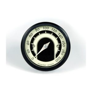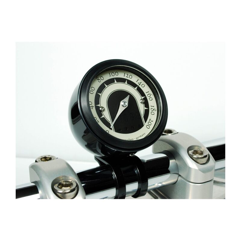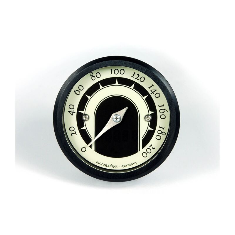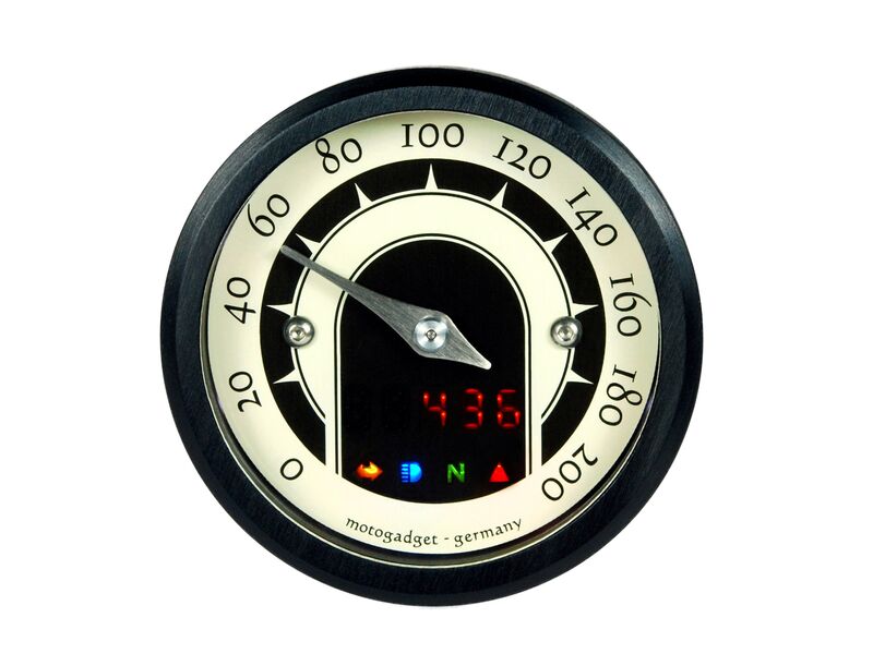 MOTOGADGET MST SPEEDSTER ANALOG Das mst speedster ist ein kleiner, analoger Tacho im attraktiven Retrodesign. Technisch ist das Instrument mit dem motoscope tiny identisch. Das Ziffernblatt ist an das Streamline-Design der Vierziger und Fünfiger Jahre angelehnt. Passend dazu ist es in einem wärmeren Weiss gehalten.Alle weiteren Eigenschaften und technischen Daten des Instruments entsprechen dem motoscope tiny. GEHÄUSE: Das hochwertige Aluminium-Gehäuse ist aus dem Vollen gedreht und seine Oberfläche schwarz eloxiert. Der Schraubring ist ebenfalls schwarz eloxiert oder hochglanzpoliert erhältlich. Das Gehäuse ist 100% wasserdicht und unempfindlich gegen Vibrationen. DISPLAY: Das analoge Ziffernblatt im Schwarzweiß-Kontrast wird von weißen LEDs indirekt beleuchtet. Hinter dem schwarzen Teil des Ziffernblattes ist eine innovative LED-Anzeige versteckt, die erst im Betrieb durch das Ziffernblatt leuchtet und im ausgeschalteten Zustand nicht sichtbar ist. Um eine optimale Ablesbarkeit bei Dunkelheit, Sonne und Dämmerung zu erreichen, wird die Leuchtstärke der LEDs automatisch angepasst. Falls die 200 km/h auf der analogen Skala überschritten werden, wird die Geschwindigkeit automatisch im LED-Display angezeigt. Ebenfalls wird die Maximalgeschwindigkeit gespeichert. Im Ziffernblatt sind ebenfalls die 4 Kontrollleuchten (blau, rot, 2 x grün) integriert. Auch diese werden erst im Betrieb sichtbar. BEDIENUNG: Mit dem mitgelieferten Menütaster oder z.B. dem Lichthupentaster am Lenker wird zwischen den Anzeigen des LED-Displays gewechselt. Die Standardanzeige auf dem Display ist die Uhrzeit. Bei Bedarf werden durch kurzen Tastendruck die Werte für Gesamtkilometer, Tageskilometer, Bordspannung usw. angezeigt. Alle Funktionen, wie Rücksetzen der Tageskilometer o. ä. sind über den Taster einfach zu bedienen. Voreinstellungen oder gespeicherte Werte bleiben selbstverständlich auch ohne Stromversorgung abgespeichert. ANBAU: Das motoscope tiny ist mittels der zwei Gewindebuchsen M3 an der Rückseite einfach anzubringen. Wir bieten für die Montage diverse Halterungen an. Siehe unter Halterungen. ANSCHLUß UND SENSOREN: Die ausführliche Montage- und Bedienungsanleitung machen den Anschluss des Instruments auch für Anwender möglich, die sich bisher von der Fahrzeugelektrik ferngehalten haben. Der mitgelieferte Tachosensor aus Edelstahl ist sehr klein (M5/23 mm) und leicht zu verstecken. Mit dem 1,5 m langen Anschlusskabel lässt er sich problemlos am Vorder- oder Hinterrad anbringen. Somit lassen sich auch Fahrzeuge mit original mechanischem Tachoantrieb einfach umrüsten. Das motoscope tiny ist mit sehr vielen originalen Tachosensoren (Reedkontakt und Näherungssensoren) der Fahrzeughersteller kompatibel. In diesem Fall werden nur noch Anschlüsse verbunden und die mechanische Installation eines Sensors wird gänzlich überflüssig. Eine intelligente Teach-Funktion ermöglicht das einfache Kalibrieren des Tachos – auch bei Fahrzeugen mit Sensoren am Getriebe wie z.B. Harley-Davidson (TM). LIEFERUMFANG: * Instrument mit ca. 75 cm Anschlusskabel * Minitaster * 2 fliegende Sicherungen * 9 Kabelendverbinder * Tachosensor (M5 x 0,5 Feingewinde, Edelstahl, IP 68) mit 150 cm Anschlusskabel * 2 starke Neodym-Mini-Magnete * 2 Befestigungsschrauben M3 mit Unterlegscheibe * 2 Dioden für die Zusammenlegung der Blinker * Ausführliche Anbau- und Bedienungsanleitung SPEZIFIKATIONEN UND FEATURES: * Einbaudurchmesser: 49 mm * Gewicht: ca. 96 g * Befestigung: 2 x M3 Gewindebuchse * Stromaufnahme im Betrieb: ca. 200 mA (belastungsabhängig) * Stromaufnahme im Ruhezustand: omA * Betriebsspannung: 9 V – 15 V * Betriebstemperatur: -20°.. +80°C * Tachometer analog (Zeiger): 0 – 200 km/h oder mph * Tachometer numerisch (LED-Display): 200 – 999 km/h oder mph * maximale Geschwindigkeit: 0 – 999 km/h oder mph * Bordspannung: 9 – 15 V * Uhrzeit: 00:00 – 23:59 * Tageskilometerzähler: 0 – 999,9 km oder mi * Gesamtkilometer (einstellbar): bis 99 999 km oder mi * Kontrollleuchten: Blinker, Fernlicht, Neutral, Warnlampe motogadget,mst speedster,Analog Tacho,tacho,tachometer,geschwindigkeitsmesser,speedo,speedometer,gauges,instruments,compteur de vitesse,tachimetro