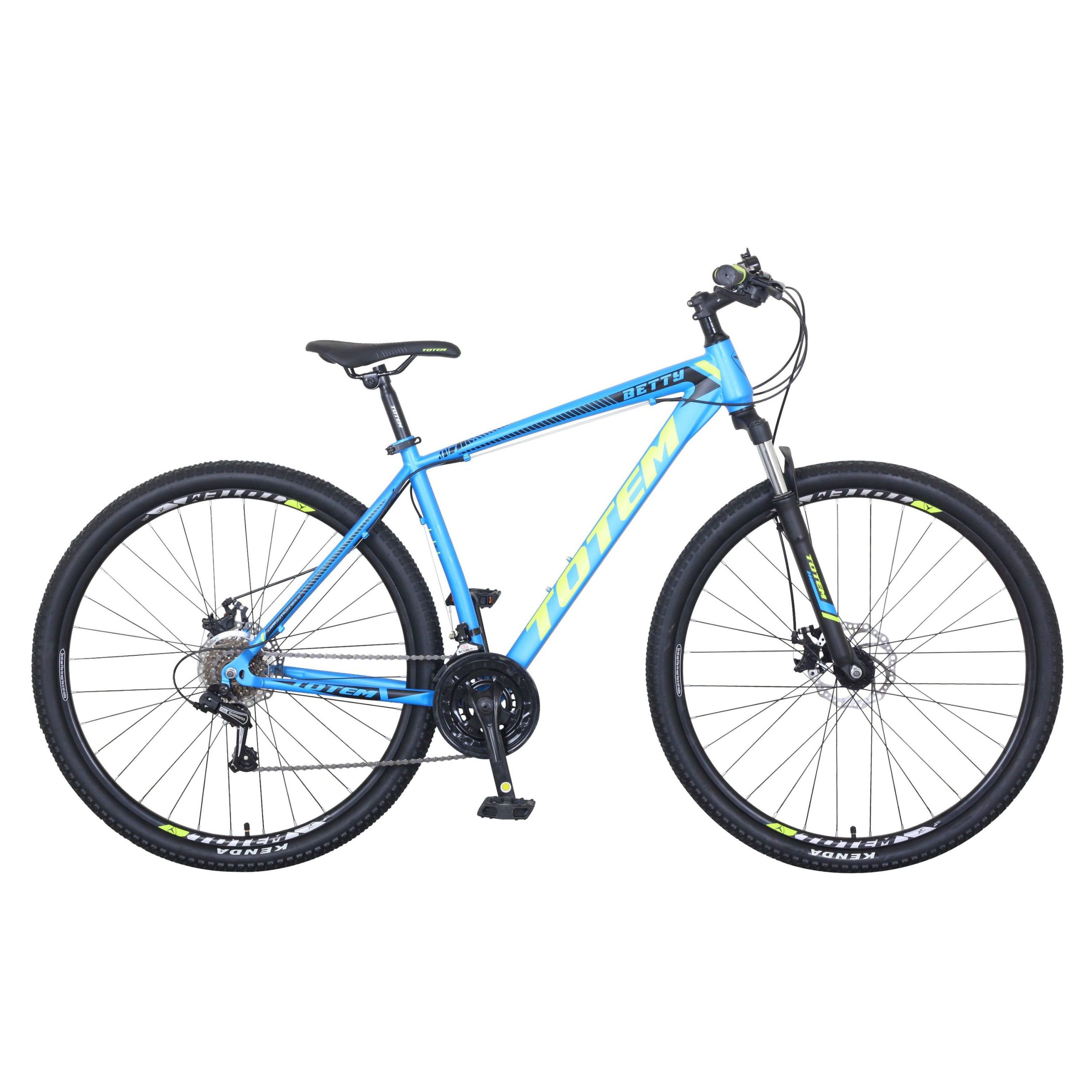 Dieses blaue Hardtail Mountainbike bietet Fahrvergnügen sowohl im Gelände und auf der Strasse. Die robuste Federgabel absorbiert Stösse beim Fahren in unebenem Terrain. Durch den ungefederten Hinterbau ist die Kraftübertragung optimal und du kommst rasant voran. Mit einer Rahmengrösse von über 48 cm und einer Laufradgrösse von 29 Zoll ist dieses Bike ideal für Personen mit einer Körpergrösse ab 180 cm. Fahre über Stock und Stein mit diesem schicken Mountainbike von TOTEM!