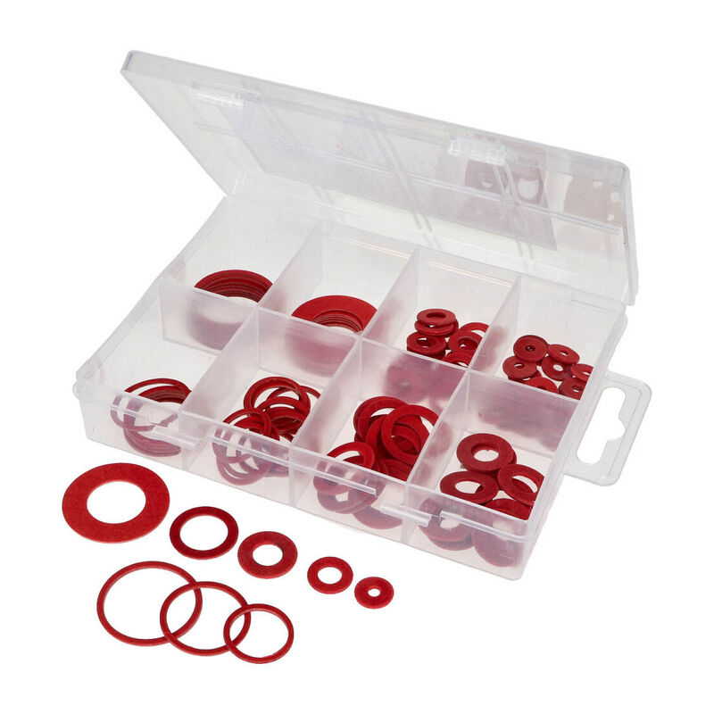 110-teiliges Sortiment Fiberunterlegscheiben inklusive Fächerkasten. Faserringe eignen sich für Klempnerarbeiten oder als Zwischenstücke bzw. Unterlegscheibe. Grössen / Durchmesser (Innen x Aussen): * 16 x 30mm * 24 x 28mm * 20 x 24mm * 15 x 18mm * 13 x 19mm * 8 x 16mm * 6 x 12mm * 3 x 10mm Lieferumfang wie auf dem Produktbild dargestellt. fiberscheiben,faserscheiben,faserdichtung,faserdichtring,fiber sealing ring,bague étanchéité en fibre,anello di tenuta in fibra