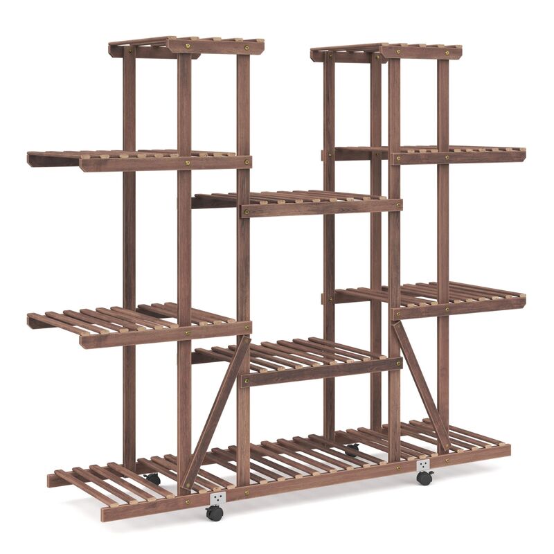 Mit sechs Etagen und neun Ablagen in verschiedenen Grössen bietet das Pflanzenregal Platz für all deine Lieblinge. Das klassische Design in Naturfarbe schafft eine entspannende Atmosphäre und lässt dich die Natur in deinem Zuhause spüren. Dank der karbonisierten Oberfläche ist das Blumenregal nicht nur stabil, sondern auch langlebig. Mit einer Tragkraft von bis zu 40 kg und vier drehbaren Rollen (zwei mit Bremsen) ist es flexibel einsetzbar – ob drinnen oder draussen. Hole dir jetzt dein persönliches Stück Natur nach Hause!