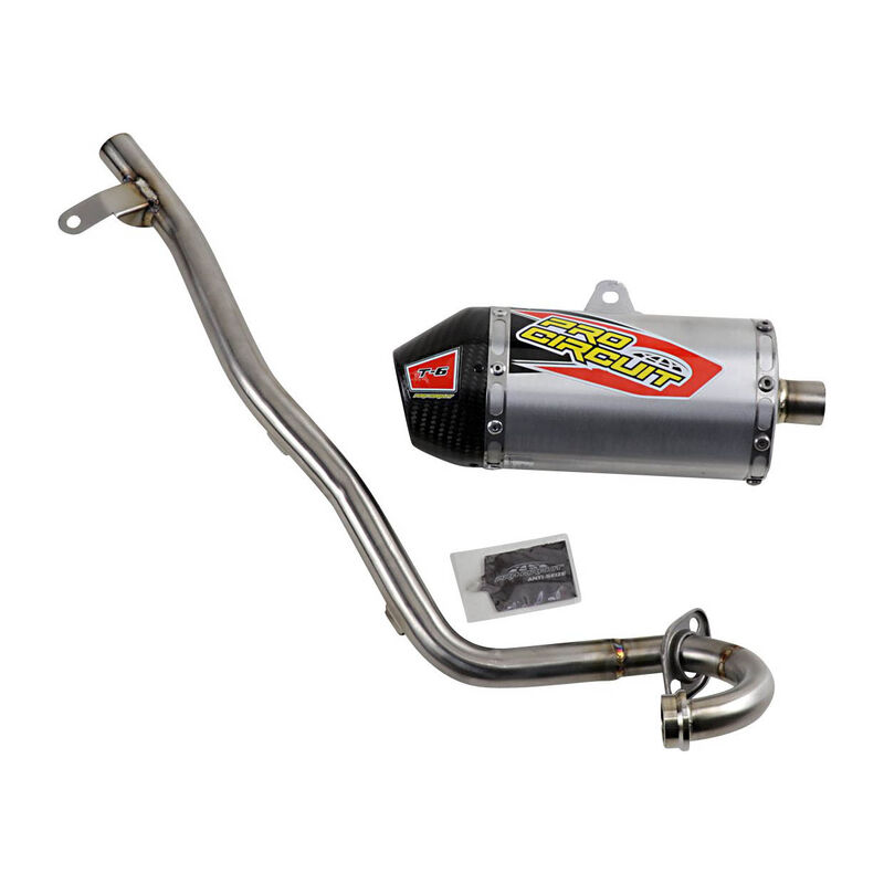 PROCIRCUIT T-6 AUSPUFFANLAGE Die T-6 Edelstahlauspuffanlage bietet maximale Leistung und ist aus Edelstahl gefertigt, der Kanister aus Aluminium. Die T-6 ist perfekt für alle Rennfahrer die eine verbesserte Leistung wollen und mehr Haltbarkeit und ein professionelles Aussehen suchen. Der Krümmer wird auch mit dem RC-4 Resonanzkammer geliefert, um die Geräuschentwicklung zu reduzieren. Der Funkenschutz kann entfernen werden für Rennen auf geschlossenen Strecken. FEATURES: * Gesteigerte Leistung * Endkappe und Krümmer aus Edelstahl – Gehäuse aus Aluminium * RC-4 Resonanzkammer zur Lärmreduzierung * TIG geschweisst * Gefräste Verbindung zwischen Mittelteil und Krümmer für eine optimale Passform ohne Leckagen * Aluminium-Halter * Made in USA Auspuffanlage,Komplettanlage,Auspuffsystem,Exhaust,Silencer,Uspuff,Topf Passend auf: HONDA CRF110F