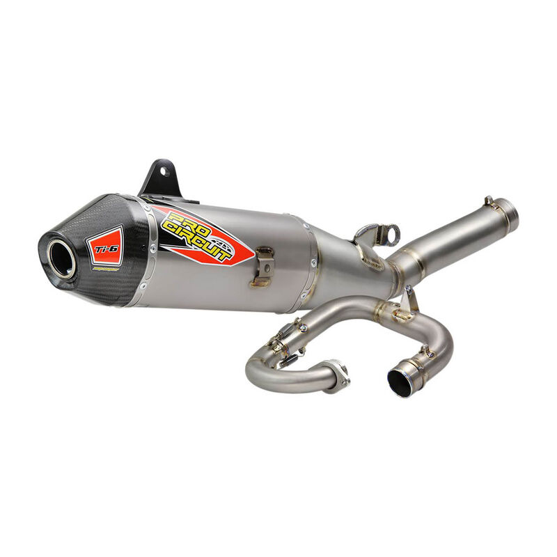 PROCIRCUIT TI-6 AUSPUFFANLAGE Die Ti-6 Titan Auspuffanlage wurde zur Leistungsoptimierung entwickelt. Der Krümmer und Schalldämpfergehäuse sind aus Titan und die Endkappe ist aus Carbonfaser gefertigt. Optimiert die Leistung, wo die Ti-5 Abgasanlage Schwächen aufwies. Und ganz nach den Wünschen unserer Kunden wurde ein charakteristischer Klang entwickelt, der zum modernen Fahrer passt. Auch wenn die Ti-6-Anlage die FIM Geräuschvorschriften nicht erfüllt, ist er dennoch die richtige Wahl für jeden Fahrer, der mehr Leistung, eine längere Haltbarkeit und einen professionellen Look möchte. Zudem ist der Ti-6 auch noch mit einem herausnehmbaren USFS-zugelassenen Funkenfänger ausgestattet, der das Fahren in offenem Gelände und auf geschlossenen Strecken gleichermassen ermöglicht. FEATURES: * Gesteigerte Leistung * Krümmer und Schalldämpfer aus Titan, Endkappe aus Carbonfaser * RC-4 Resonanzkammer zur Lärmreduzierung * TIG geschweisst * Gefräste Verbindung zwischen Mittelteil und Krümmer für eine optimale Passform ohne Leckagen * Aluminium-Halter * Abnehmbarer USFS geprüfter Funkenfänger und optionale Einsätze für Rennen in geschlossenem Gelände Auspuffanlage,Komplettanlage,Auspuffsystem,Exhaust,Silencer,Uspuff,Topf Passend auf: YAMAHA WR250F YZ250F