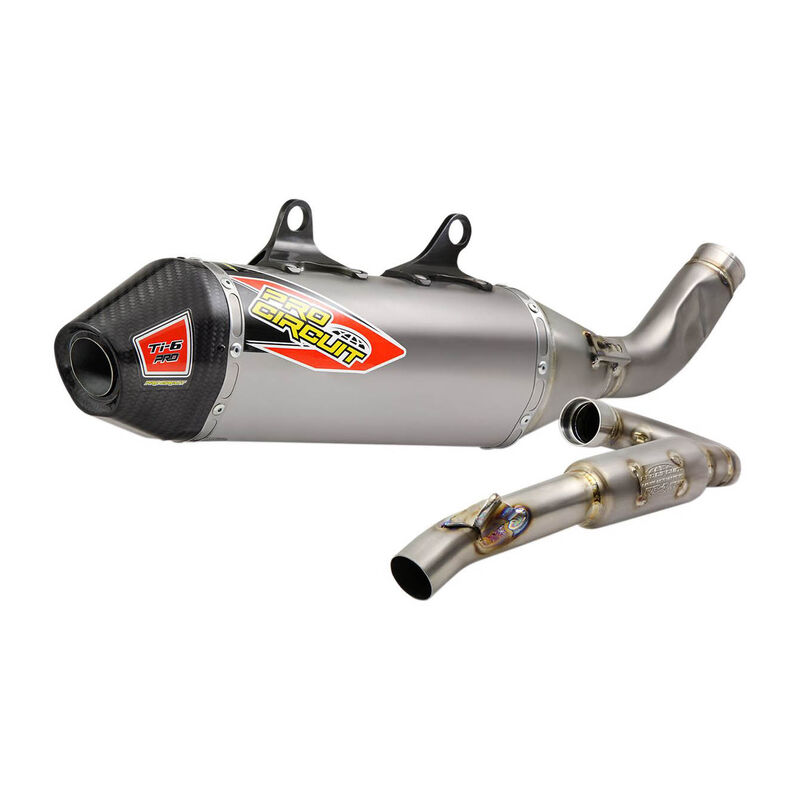 PROCIRCUIT T-6 PRO AUSPUFFANLAGE Die Ti-6 Pro Titan Auspuffanlage wurde zur Leistungsoptimierung entwickelt. Der Krümmer, der Y-Mittelteil und das Schalldämpfergehäuse sind aus Titan und die Endkappe ist aus Carbonfaser gefertigt. Optimiert die Leistung, wo die Ti-5 Abgasanlage Schwächen aufwies. Und ganz nach den Wünschen unserer Kunden wurde ein charakteristischer Klang entwickelt, der zum modernen Fahrer passt. Die Ti-6-Pro Anlage wurde speziell für professionelle Fahrer entwickelt und erfüllt die FIM Geräuschvorschriften. Dafür ist der Ti-6 Pro ohne Funkenfänger ausgestattet. FEATURES: * Gesteigerte Leistung * Y-Mittelteil und Schalldämpfer aus Titan, Endkappe aus Carbonfaser * RC-4 Resonanzkammer zur Lärmreduzierung * TIG geschweisst * Gefräste Verbindung zwischen Mittelteil und Krümmer für eine optimale Passform ohne Leckagen * Aluminium-Halter * Erfüllt die FIM Geräuschvorschriften * Made in USA Auspuffanlage,Komplettanlage,Auspuffsystem,Exhaust,Silencer,Uspuff,Topf Passend auf: GAS GAS MC 250F HUSQVARNA FC250 KTM 250 SX-F