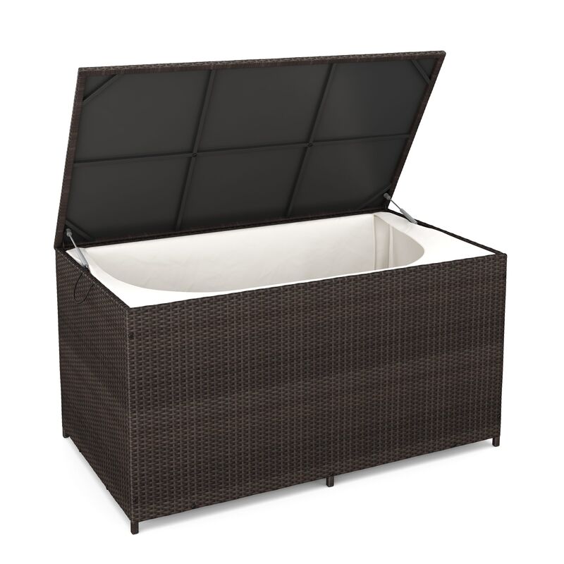 Die stylische Kissenbox ZOE wird aus dem strapazierbaren Rattan PE fabriziert. Dank dem pulverbeschichteten Stahlrahmen ist die Box extra stabil.