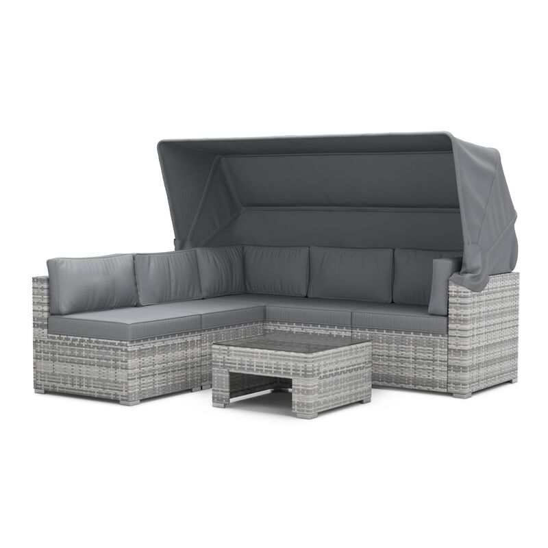 Mit der Rattankombi COMO in dezenten Grautönen wird dein Gartensitzplatz zur Chillout-Lounge! Die Sofalandschaft mit komfortablen Kissen bietet viel Platz für Partys oder zum Ausspannen. Das grosszügige Sonnendach sorgt für Privatsphäre und schützt vor Wind und Sonne. Ordne die Sofa-Elemente ganz nach deinen Wünschen und erschaffe entweder eine grosse Liegefläche oder mehrere Sitzplätze. Stelle schon mal die Drinks kalt – mit der hochwertigen Rattanlounge COMO kann der Sommer kommen!
